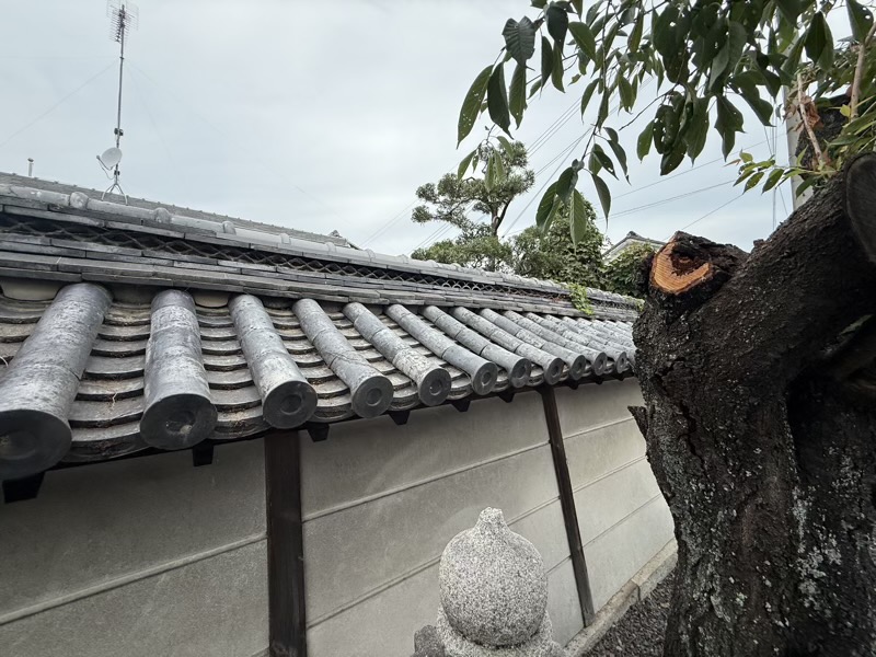 お寺の塀の上にある瓦がずれたり、割れたりしてしまいました。