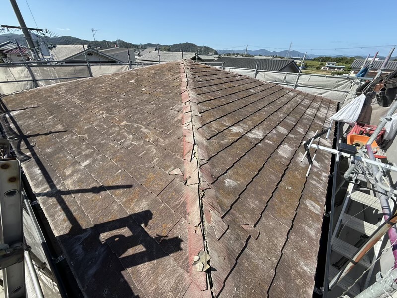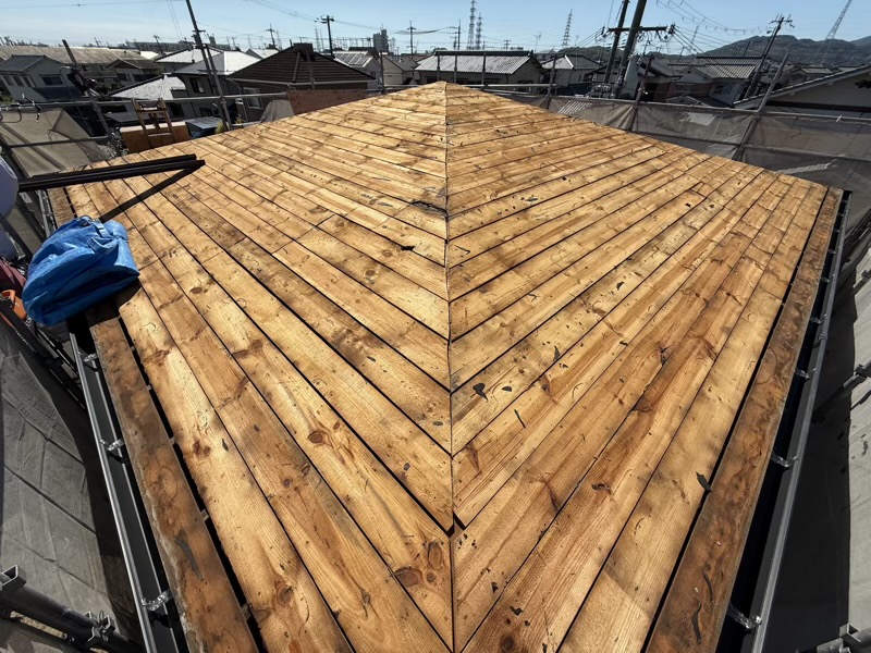 今回の工事では、まず古い屋根をすべて取り外し、屋根の土台からきれいにやり直しました。